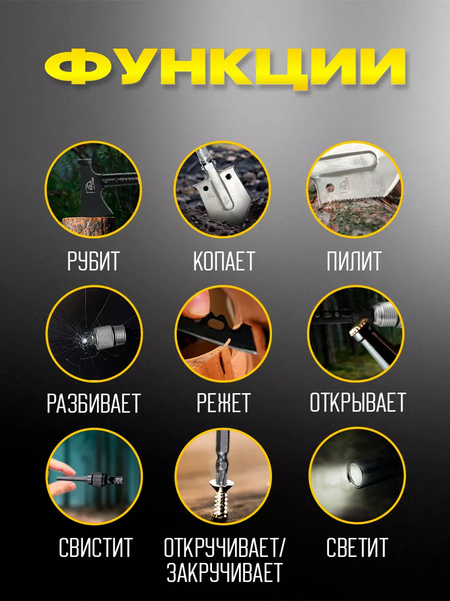 Профессиональный набор для выживания KILACAMP включает саперную лопату, топор и множество дополнительных инструментов в компактном чехле. Лопата выполняет функции пилы, мотыги и линейки, а топор идеален для колки дров. Набор изготовлен из нержавеющей стали и включает фонарь с сигнальными режимами, нож, открывалку и другие essential-инструменты. Идеальное решение для туризма, охоты, рыбалки и экстремальных ситуаций.